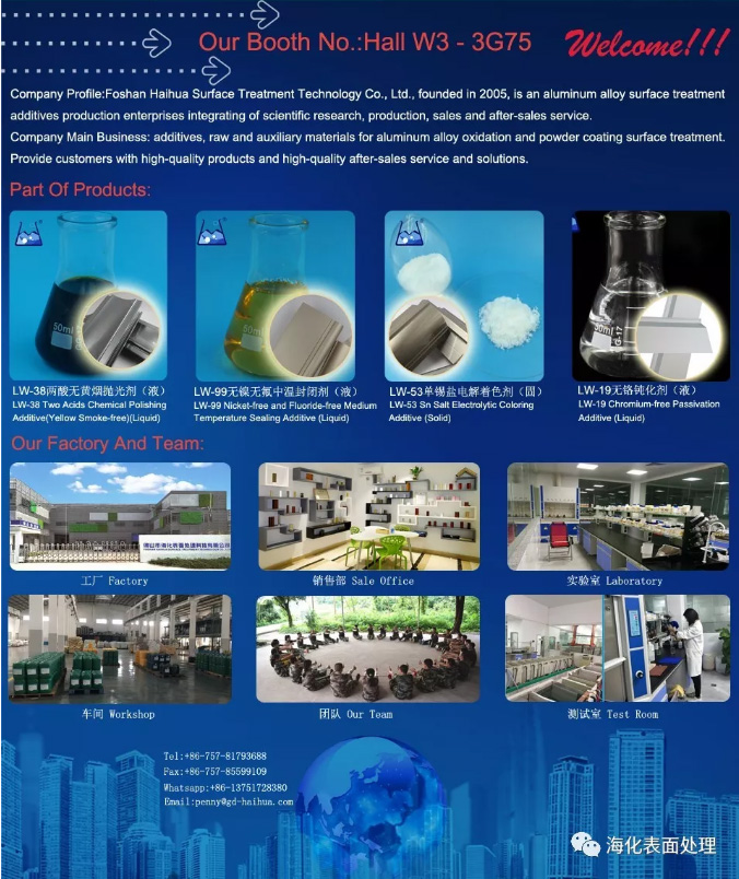 邀請函 最后1天,會展中心鋁工業展馬上就要來了,屆時海化科技將攜熱銷產品與朋友們見面,歡迎廣大客戶蒞臨參觀! 展會時間:2018年7月11日-7月13日 展會號:上海新國際博覽中心W3館 3G75 熱銷產品:強勢推出:無鎳無氟中溫封孔 環保產品:兩酸拋光/無鉻鈍化/單錫著色/無氟光亮等