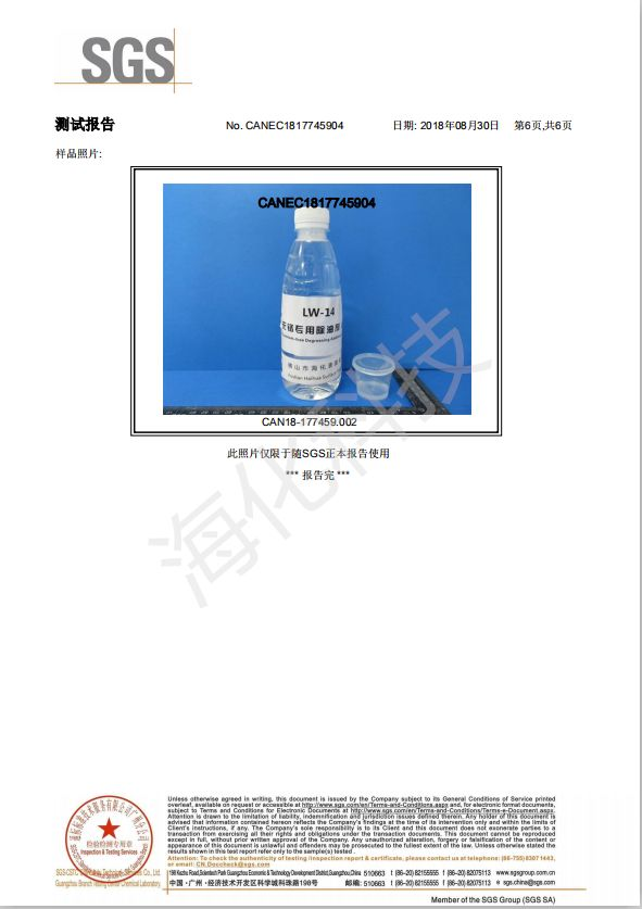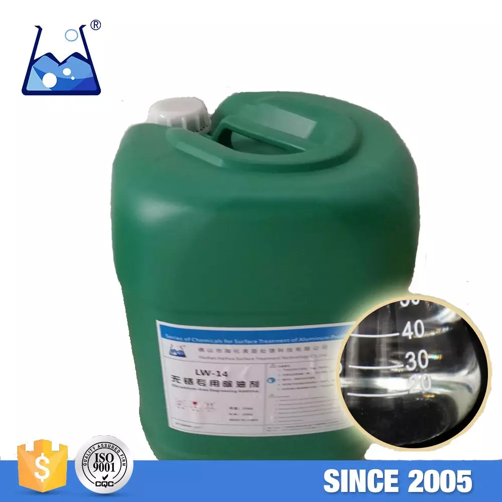 LW-14 Chromium-free Degreasing Additive is a kind of colorless to yellowish transparent liquid with powerful degreasing surface active agent, emulsifier and functional agent.This product can efficiently remove aluminum surface grease, stains and natural oxidation film and results no harm to aluminum profiles. LW-14 is used for pre-treatment of aluminum profiles powder coating and anodization. It has advantages of low cost, little aluminum consumption and energy-saving comparing to alkaline etching treatment..